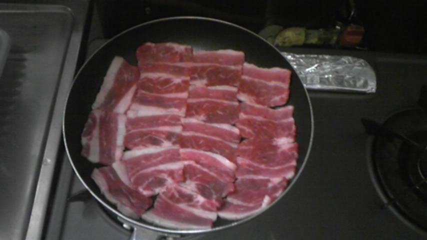 ( 神 ;゚д゚ ) うぉ!かなり入ってた肉を一度に焼くのか!?しかも隙間なくぴったりに